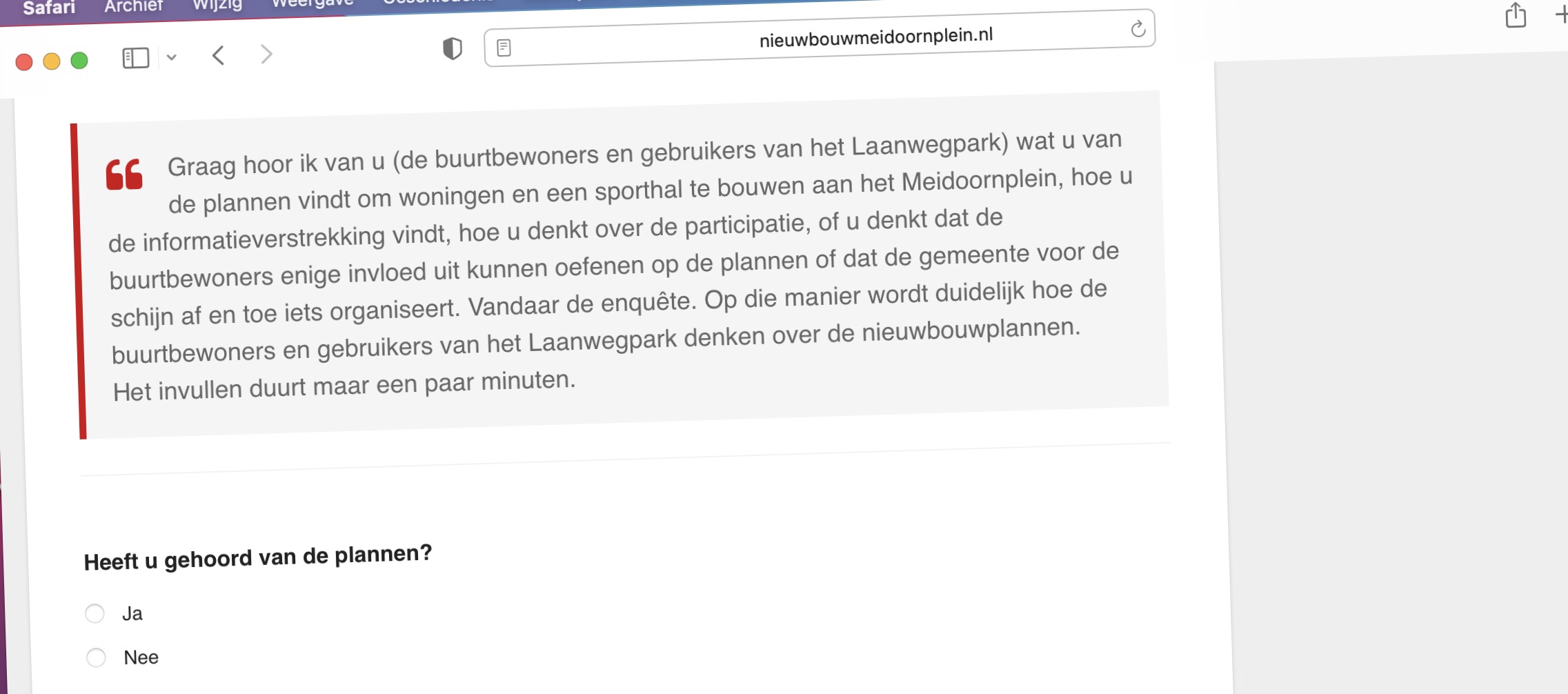 Graag hoor ik van u (de buurtbewoners en gebruikers van het Laanwegpark) wat u van de plannen vindt om woningen en een sporthal te bouwen aan het Meidoornplein, hoe u de informatieverstrekking vindt, hoe u denkt over de participatie, of u denkt dat de buurtbewoners enige invloed uit kunnen oefenen op de plannen of dat de gemeente voor de schijn af en toe iets organiseert. Vandaar de enquête. Op die manier wordt duidelijk hoe de buurtbewoners en gebruikers van het Laanwegpark denken over de nieuwbouw plannen. Het invullen duurt maar een paar minuten.